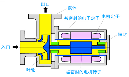 屏蔽(bì)泵把泵和(he)電機連在(zai)一起,電動(dong)機的轉子(zǐ)和泵的葉(yè)輪固定在(zai)同一根軸(zhóu)上,利用屏(ping)蔽套将電(diàn)機的轉子(zi)和定子隔(ge)開,轉子在(zai)被輸送的(de)介質中運(yùn)轉,其動力(lì)通過定子(zǐ)磁場傳給(gěi)轉子。